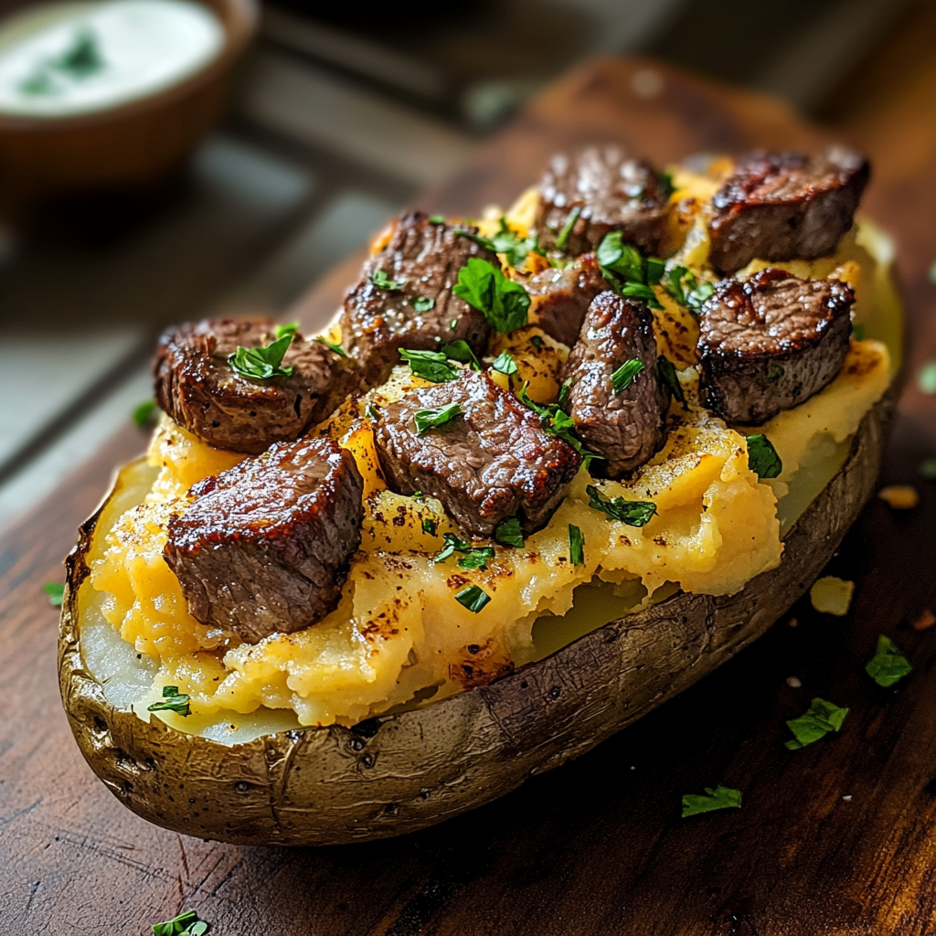 Pommes de Terre au Four Garnies de Bouchées de Steak