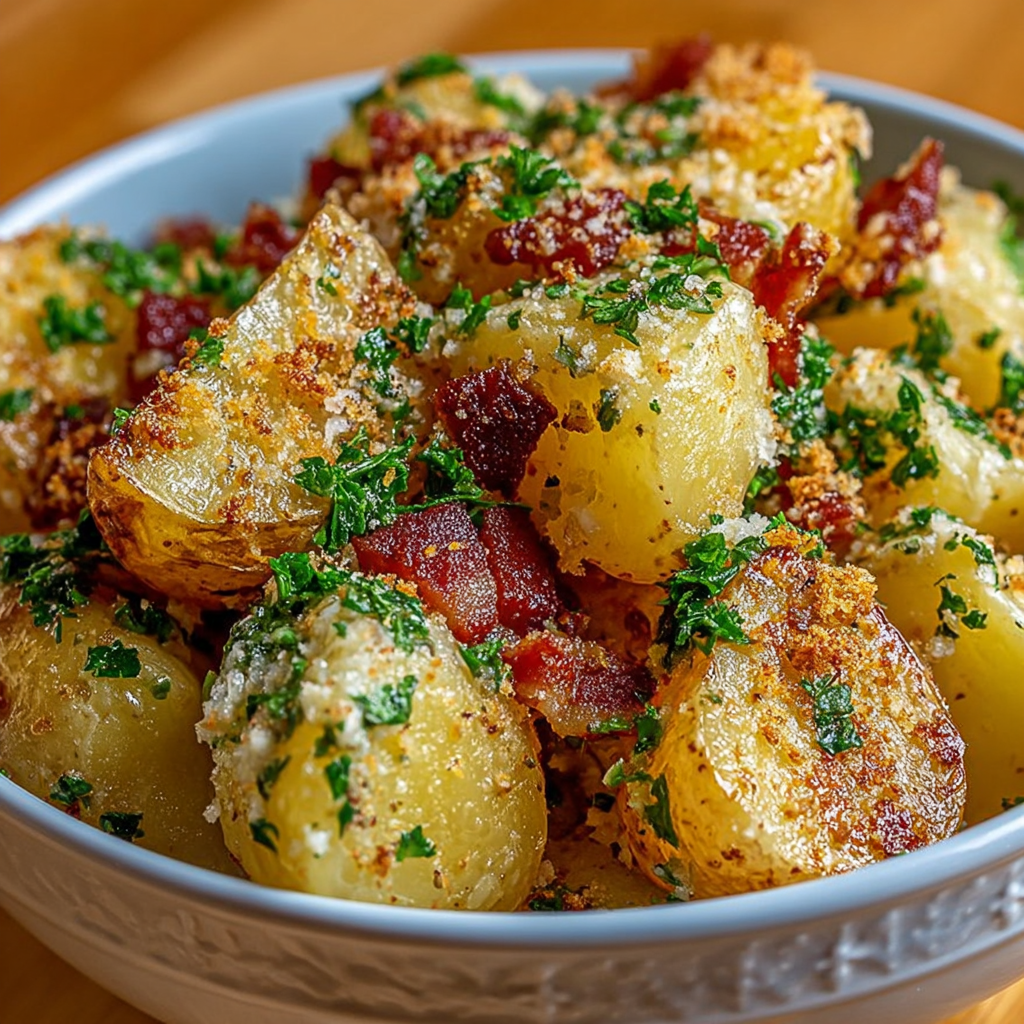Ce plat est un grand classique des buffets et repas de fête. Les pommes de terre croustillantes associées au bacon fumé et à une persillade fraîche offrent un contraste parfait entre fondant, croustillant et parfum herbacé. C’est une recette simple, économique et extrêmement appréciée par tous les invités.
