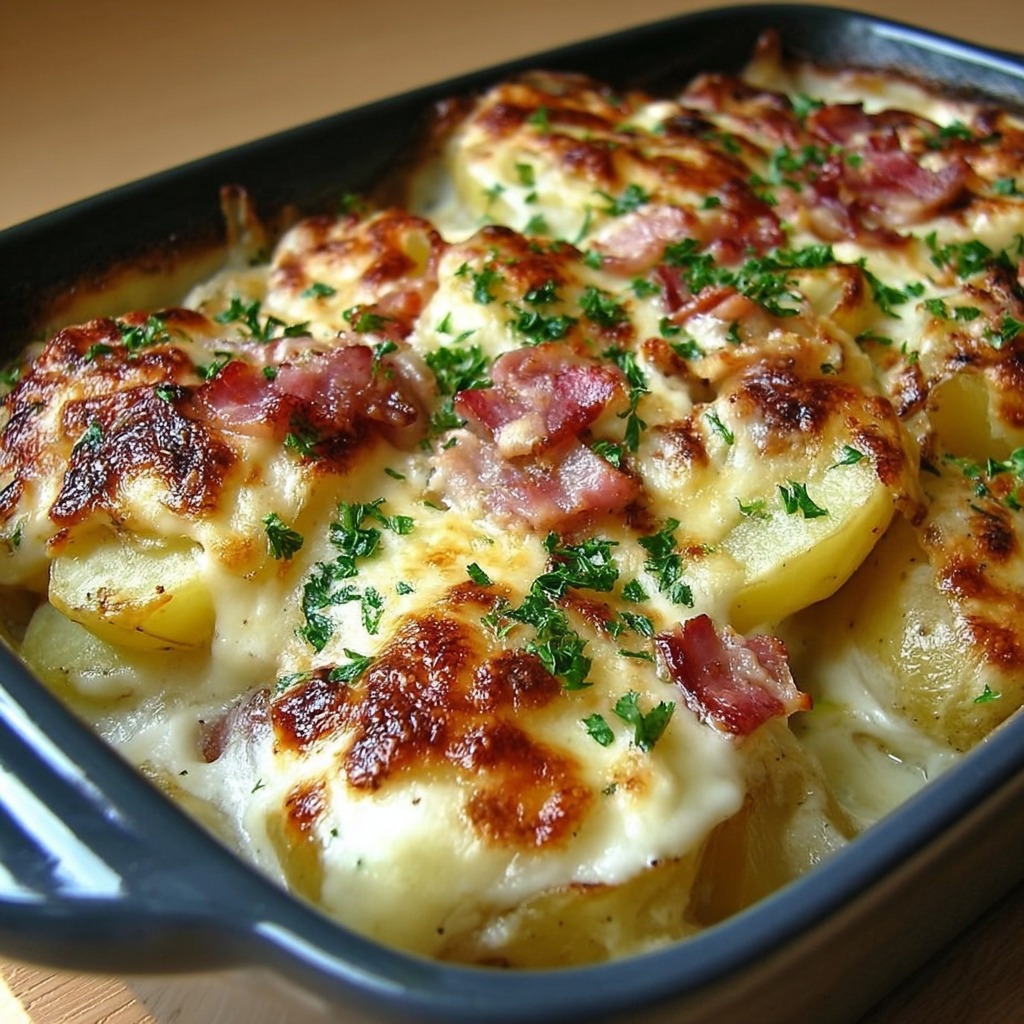 Le gratin de pommes de terre est une recette traditionnelle française, issue des régions de montagne où le plat servait à réchauffer les repas familiaux avec des ingrédients simples mais savoureux. L’ajout de bacon et de fromage transforme cette version classique en un plat plus gourmand et contemporain, parfait pour les repas conviviaux ou festifs.