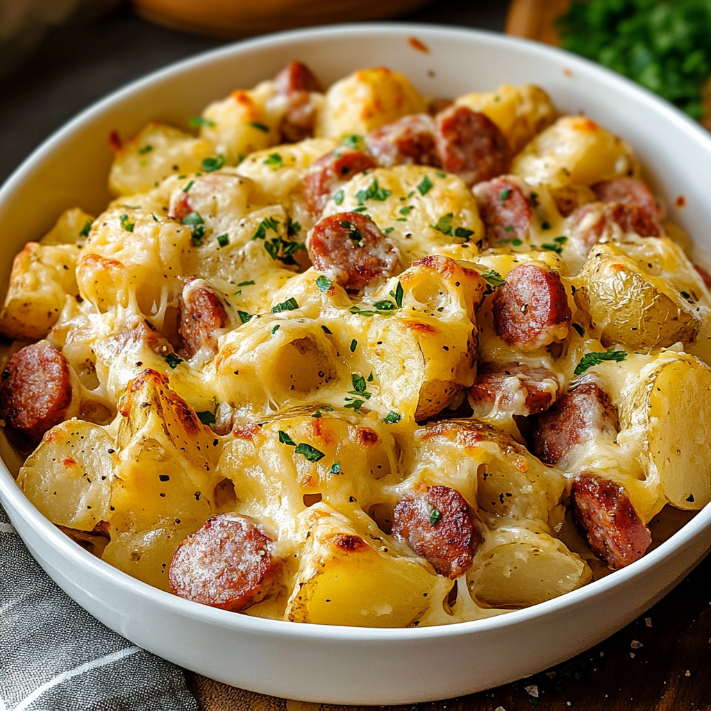 Le mélange de pommes de terre tendres, de saucisse fumée riche en goût, et de fromage cheddar fondant en fait un repas parfait pour les amateurs de plats généreux. De plus, elle est personnalisable selon vos préférences : ajoutez des légumes, remplacez le cheddar par un autre fromage ou encore variez les herbes pour une touche de nouveauté à chaque fois.