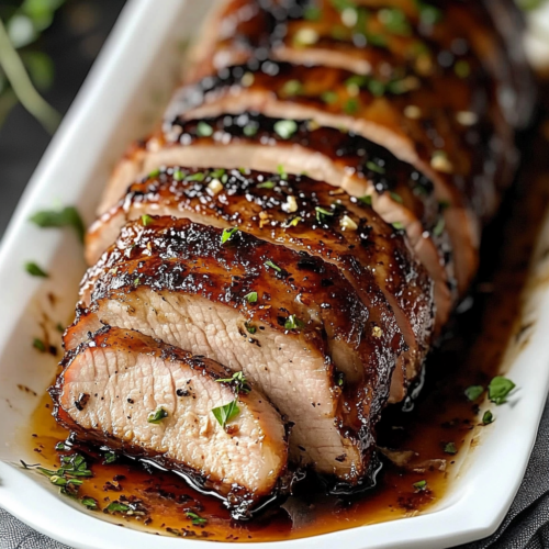 La présentation de ce plat est simple mais élégante. Vous pouvez servir le rôti de porc coupé en tranches, nappé de sauce balsamique réduite, et accompagné de légumes de saison ou d’une salade fraîche pour un contraste agréable. Pour un repas encore plus raffiné, vous pouvez garnir le plat de quelques feuilles de persil frais ou de romarin.