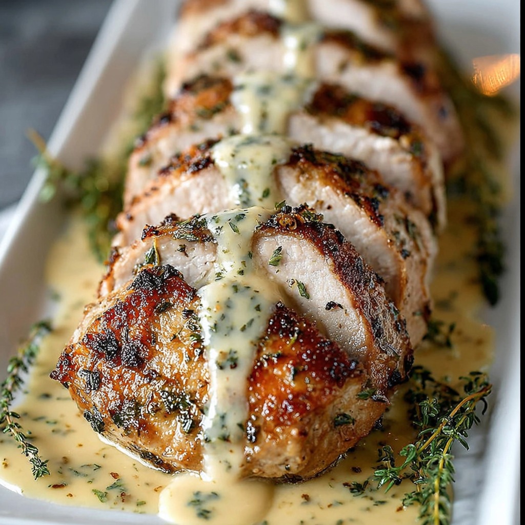 Le porc en croûte d’herbes offre une chair tendre et juteuse contrastant avec la croûte parfumée et légèrement croustillante. Les herbes et l’ail apportent fraîcheur et profondeur, tandis que le bouillon et les oignons fondus ajoutent rondeur et onctuosité à chaque bouchée.