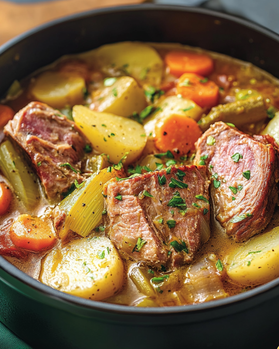 Lorsque la cuisson est terminée, retirez la cocotte du feu. Égouttez les viandes et les légumes, puis disposez-les dans un plat creux préchauffé. Servez chaud, accompagné de pain croustillant pour savourer la sauce.