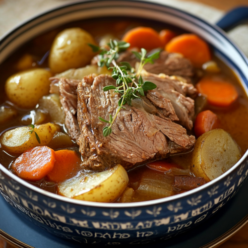 Une fois les légumes cuits et la viande tendre, il est temps de servir. Retirez délicatement les morceaux de viande de la marmite et coupez-les en tranches épaisses. Disposez-les dans des assiettes avec les légumes et arrosez généreusement de bouillon chaud. Le pot-au-feu se déguste idéalement bien chaud, accompagné de moutarde forte, de cornichons ou même d’un peu de pain frais pour accompagner les saveurs riches et réconfortantes.