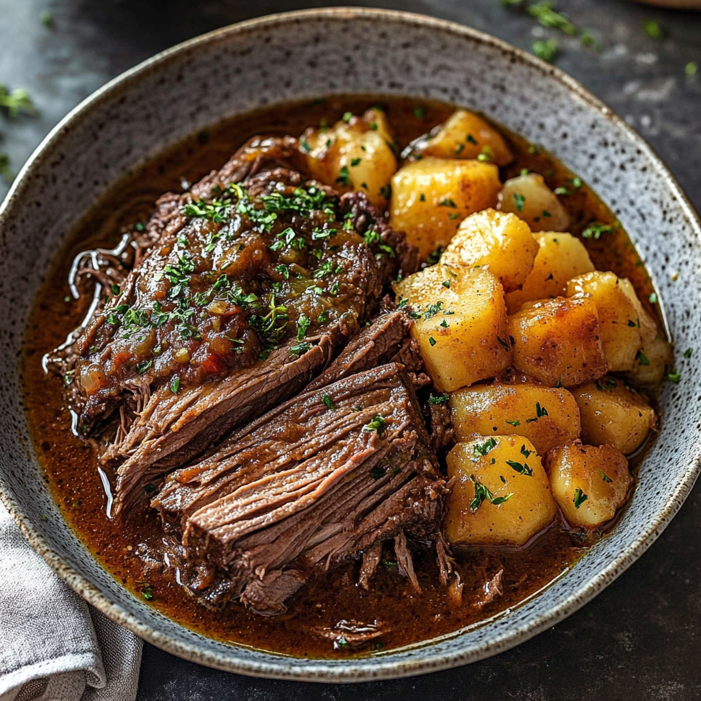 Le Pot Roast, ce plat réconfortant, est parfait pour les journées où vous avez besoin d’un repas copieux sans trop d’effort. Grâce à la cuisson lente, la viande devient incroyablement tendre et savoureuse, tout en s’imprégnant des arômes des légumes et des épices. Que vous le serviez en famille ou entre amis, ce rôti mijoté impressionnera tout le monde.