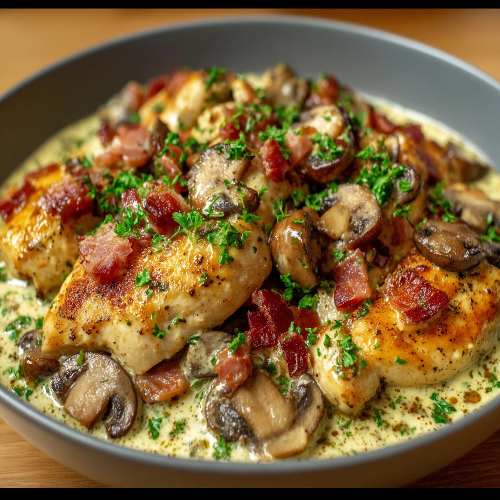 Ce plat repose sur l’association de textures et de saveurs : le moelleux du poulet, le croquant et le goût fumé des lardons, et la douceur des champignons. La sauce crémeuse à la moutarde lie tous les éléments, apportant harmonie et profondeur gustative.