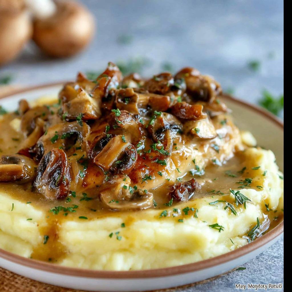 Une fois le poulet et la sauce prêts, les morceaux de poulet sont replacés dans la poêle pour quelques minutes, afin qu’ils s’imprègnent des saveurs et que la sauce nappe uniformément chaque pièce. Les assiettes sont dressées en plaçant une portion généreuse de purée de pommes de terre, surmontée d’une aiguillette ou d’un filet de poulet, puis nappée de sauce aux champignons. Le persil haché peut être saupoudré sur le dessus pour la présentation finale et un parfum frais supplémentaire.