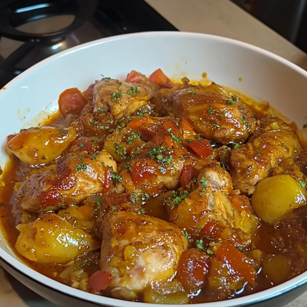 Poulet mijoté aux poivrons, tomates et piment d’Espelette, un authentique classique basque plein de saveurs.