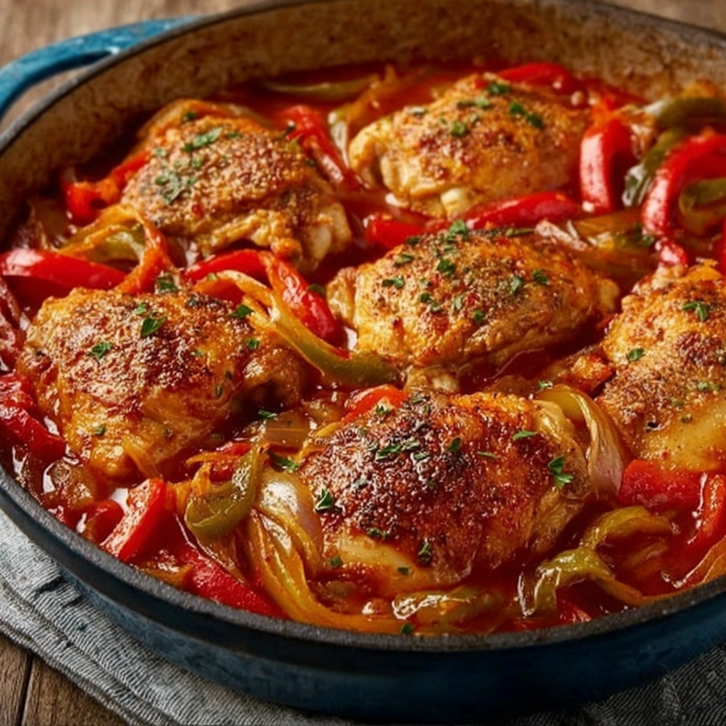 Ce plat traditionnel associe du poulet tendre à une sauce mijotée à base de poivrons, tomates, oignons et épices. Il est à la fois simple à préparer et incroyablement savoureux.