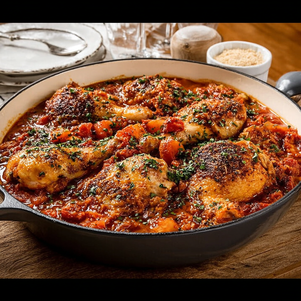 Le poulet chasseur à l’italienne est un plat classique revisité avec des saveurs méditerranéennes : tomates fraîches, herbes aromatiques, vin blanc, ail et oignons. Ce plat est idéal pour les repas en famille ou entre amis, car il est généreux, réconfortant et profondément savoureux. Il combine la tendreté du poulet mijoté avec la richesse d’une sauce parfumée, légèrement épicée, qui rappelle les saveurs ensoleillées de l’Italie.