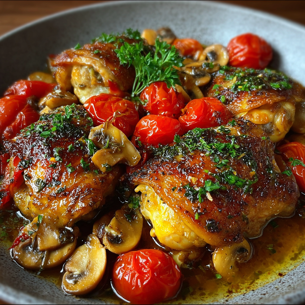 Le Poulet Chasseur, ou “Coq au Vin blanc” dans certaines variantes, est un classique de la cuisine française. Son nom vient de la tradition des chasseurs, qui préparaient ce plat avec du gibier ou du poulet, des champignons et du vin, pour un repas copieux et parfumé. Cette recette met en valeur un poulet tendre et juteux cuit lentement dans une sauce aux champignons, vin blanc et tomates, parfumée aux herbes aromatiques.