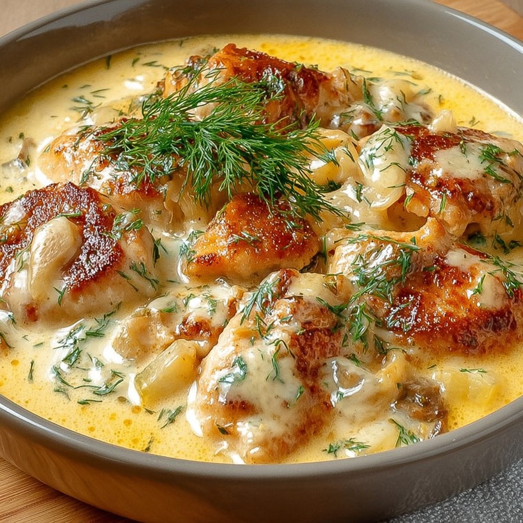 Le service consiste à disposer les morceaux de poulet sur un plat chaud et à napper généreusement de sauce crémeuse. L’aneth frais en finition apporte couleur et parfum supplémentaire, renforçant l’élégance et la fraîcheur du plat. Ce poulet crémeux peut être accompagné de riz, de pommes de terre vapeur ou de légumes verts, qui absorbent la sauce et complètent harmonieusement l’ensemble.