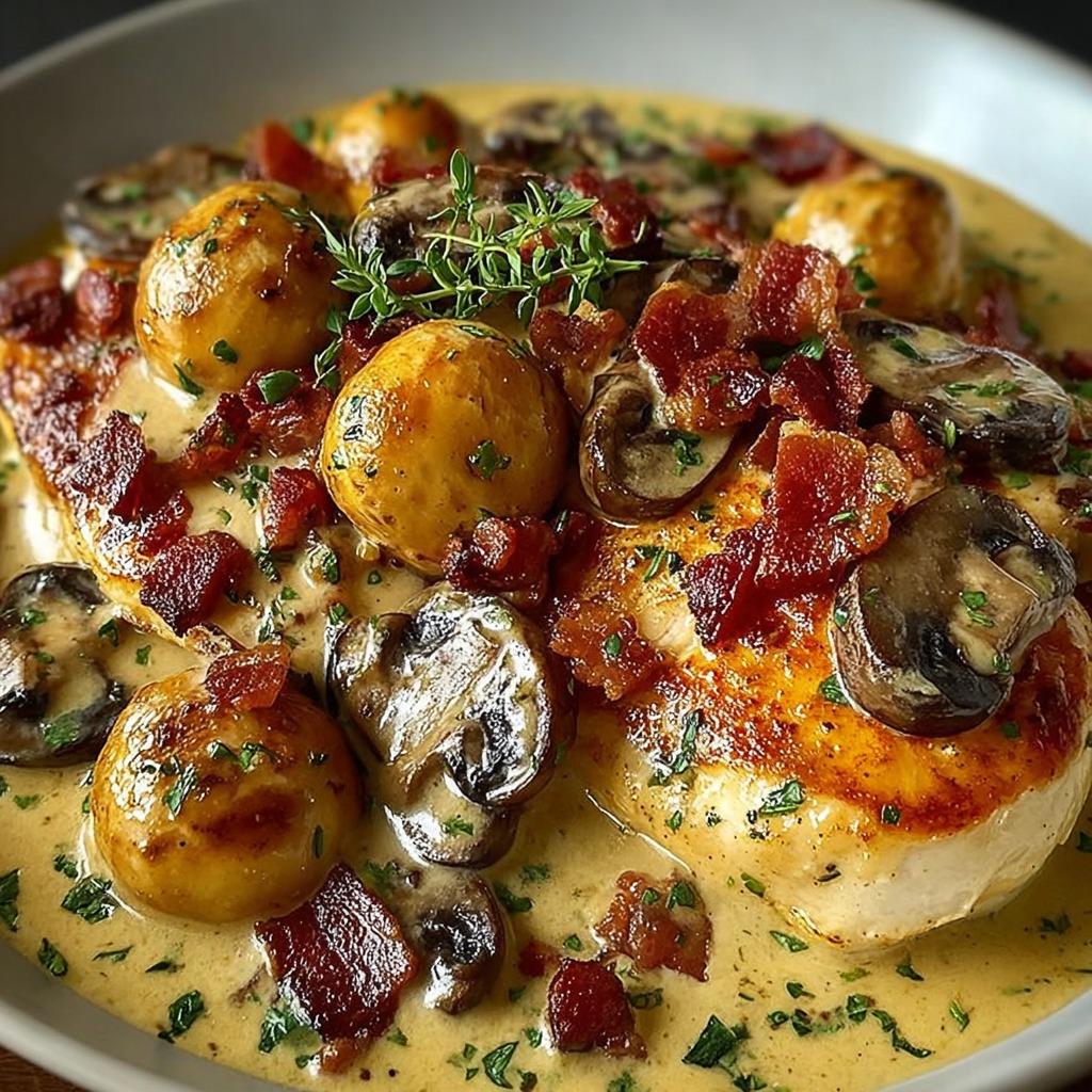 Poulet Crémeux à la Moutarde, Champignons et Lardons