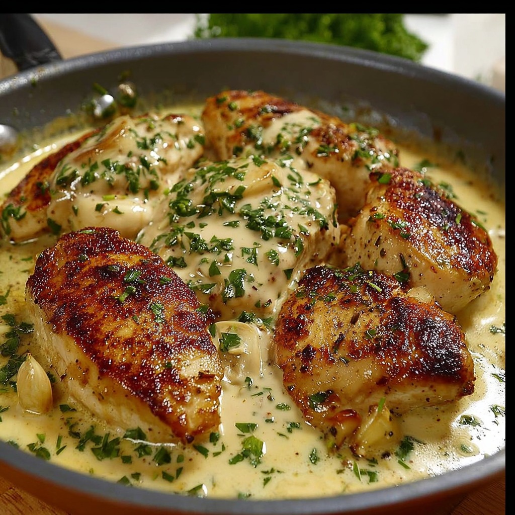 Le poulet crémeux à l’ail est servi chaud, nappé généreusement de sauce. La finition au persil frais apporte une touche de fraîcheur visuelle et aromatique. La présentation reste simple, mettant en valeur la richesse naturelle du plat et la brillance de la sauce.