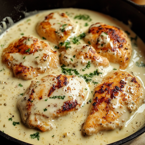 Retirez le poulet de la poêle et réservez-le. Ajoutez la crème épaisse dans la poêle, puis incorporez le fromage Asiago râpé. Remuez constamment à feu doux jusqu’à ce que le fromage fonde complètement et que la sauce devienne crémeuse et épaisse. Vous pouvez ajuster la consistance de la sauce en ajoutant un peu plus de crème si nécessaire.