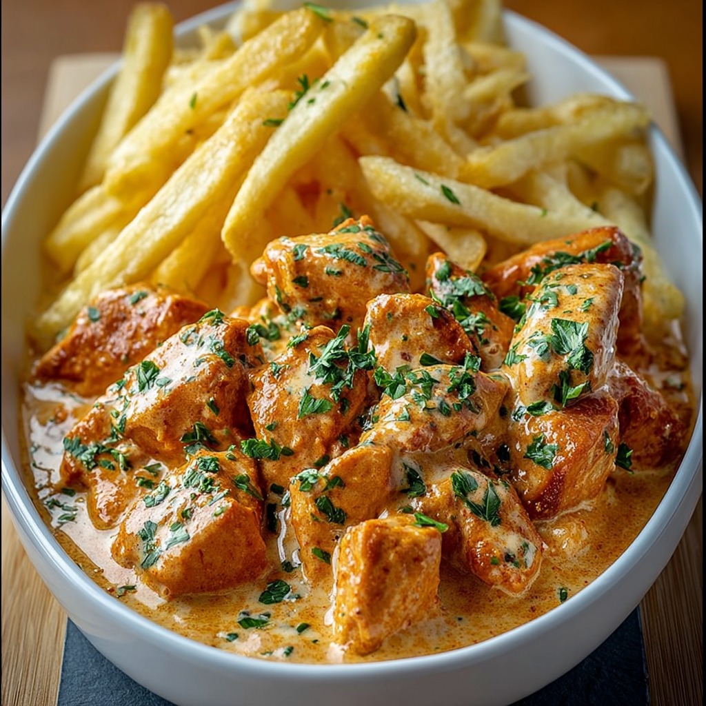 Ce plat illustre l’influence des épices dans la cuisine française contemporaine, associant la simplicité du poulet aux saveurs aromatiques du paprika. Les frites dorées accompagnent traditionnellement les préparations de viande, offrant un contraste croustillant et réconfortant. Servi chaud, ce plat familial est à la fois convivial, gourmand et parfum