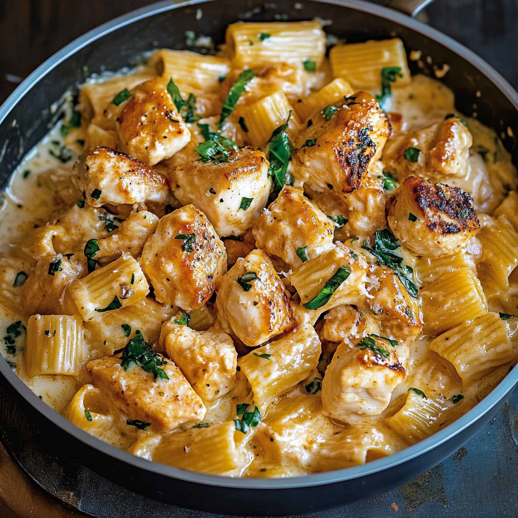 - Ajoutez le poulet cuit à la poêle, puis incorporez les rigatoni en veillant à ce que tous les ingrédients soient bien enrobés de sauce.