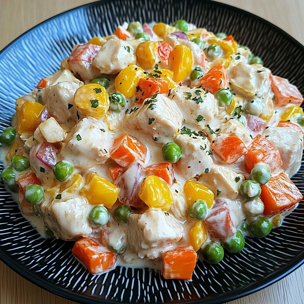 Un délicieux poulet crémeux accompagné de légumes colorés, le tout dans une sauce onctueuse à la crème fraîche. Parfait pour un dîner rapide et savoureux !