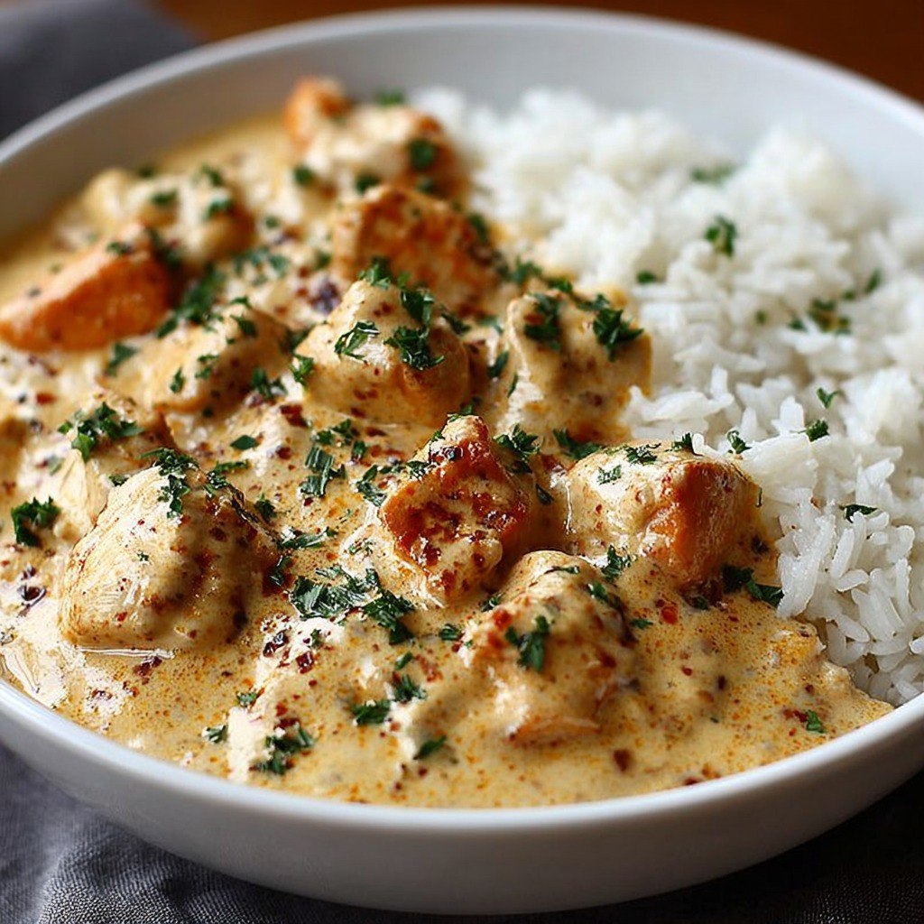 Ce plat réconfortant réunit des morceaux de poulet tendres et savoureux, du riz moelleux, le tout nappé d’une sauce crémeuse onctueuse. Adapté pour quatre personnes, ce repas familial est rapide à préparer, complet et équilibré. Il combine la douceur de la crème, la légère acidité du bouillon et les épices, pour satisfaire petits et grands sans complication.