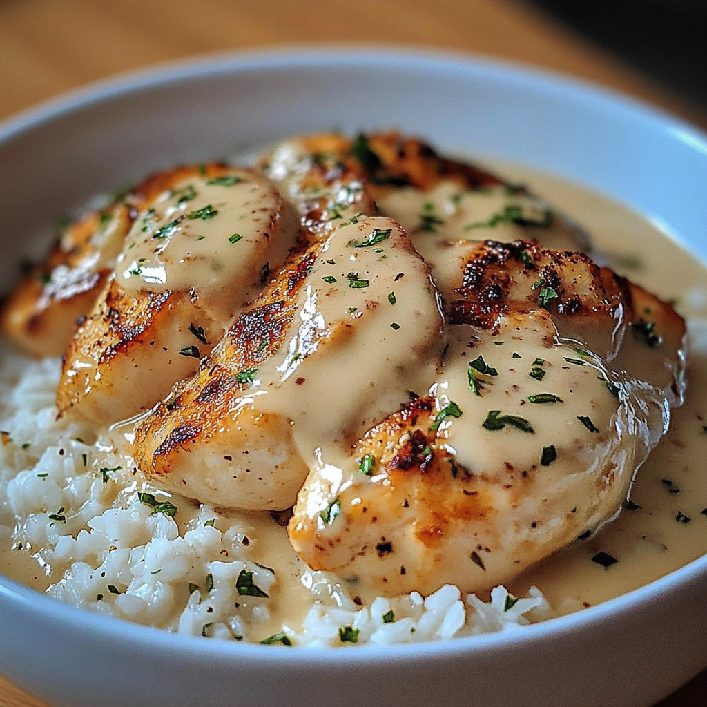 Déposez délicatement les filets de poulet crémeux sur le riz.