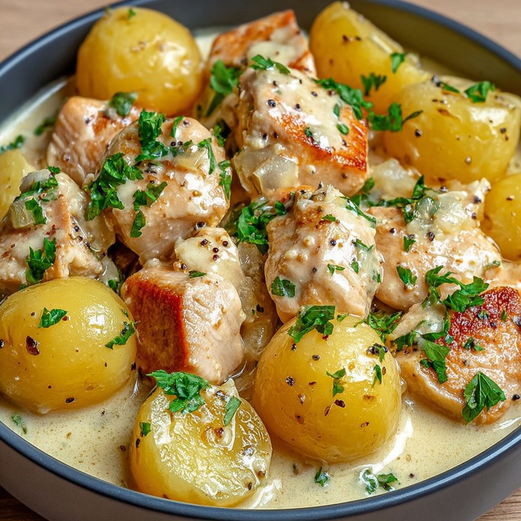La sauce crémeuse est préparée en mélangeant la crème fraîche avec la moutarde à l’ancienne et le bouillon de volaille. Ce mélange est versé sur le poulet et les pommes de terre, puis maintenu à feu doux pour permettre à la sauce d’épaissir légèrement et d’enrober uniformément tous les ingrédients. Les herbes fraîches sont ajoutées en fin de cuisson pour parfumer délicatement le plat et apporter une note de fraîcheur. L’assaisonnement est ajusté selon le goût pour garantir un équilibre parfait entre la richesse de la crème, le piquant subtil de la moutarde et la douceur du poulet et des pommes de terre.