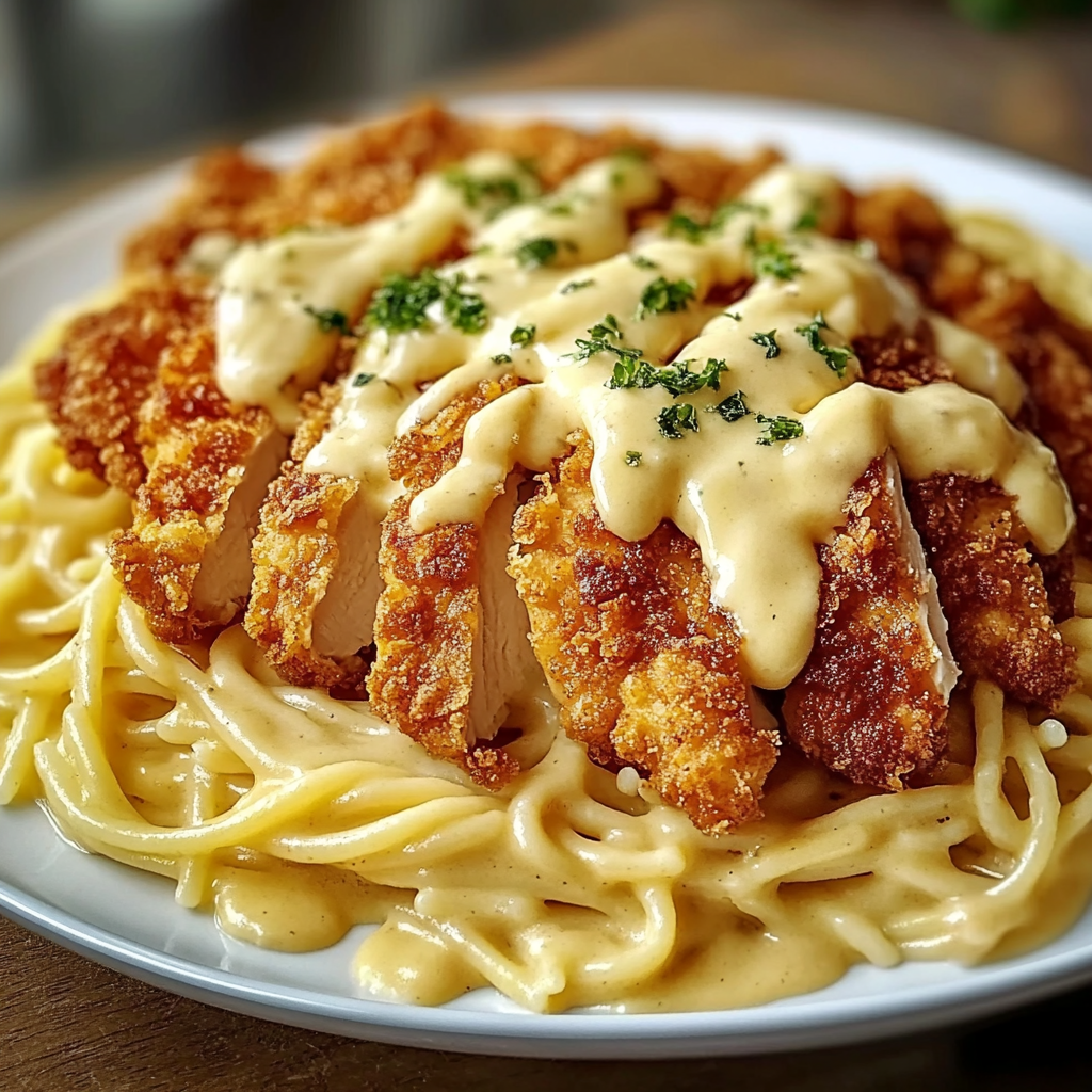 Servez les pâtes crémeuses sur des assiettes individuelles. Disposez les poitrines de poulet croustillant sur le dessus. Garnissez de persil frais et, si désiré, d’un peu de parmesan supplémentaire pour une touche finale.