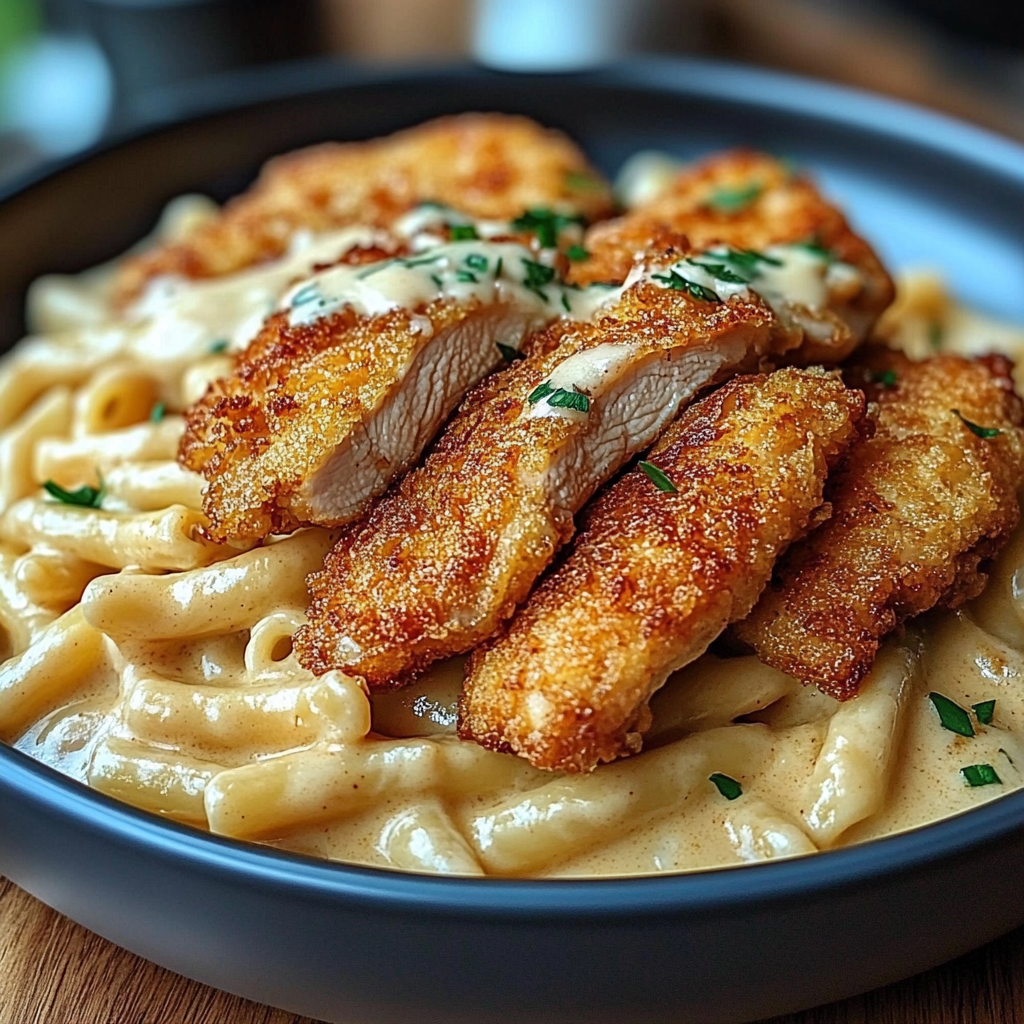 Le poulet croustillant avec pâtes crémeuses est une combinaison irrésistible de textures et de saveurs. Le croustillant doré du poulet contraste parfaitement avec la richesse veloutée des pâtes en sauce. Idéal pour un dîner réconfortant ou une soirée entre amis, ce plat est à la fois impressionnant et simple à préparer.
