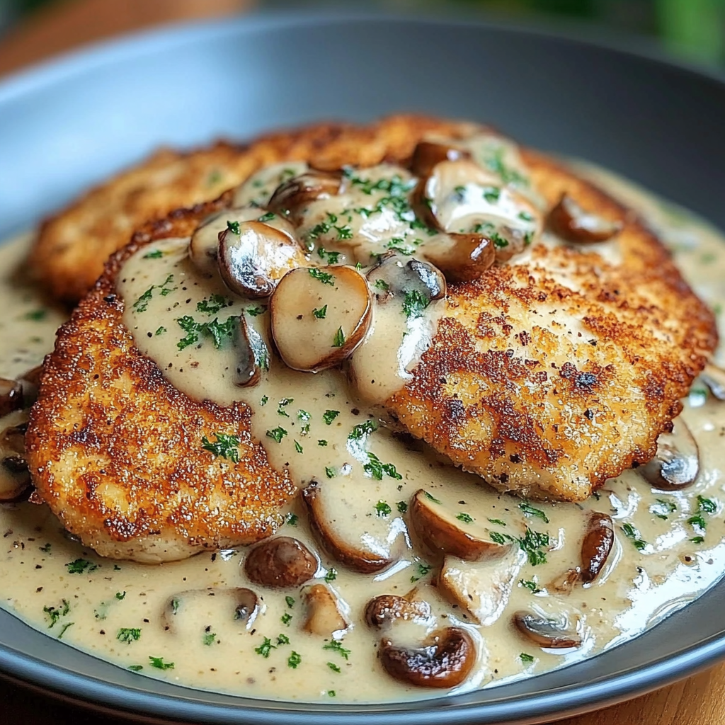 Poulet Croustillant Doré avec Sauce aux Champignons et au Parmesan