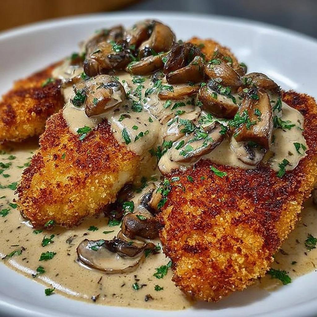 Poulet croustillant doré avec sauce aux champignons et au parmesan