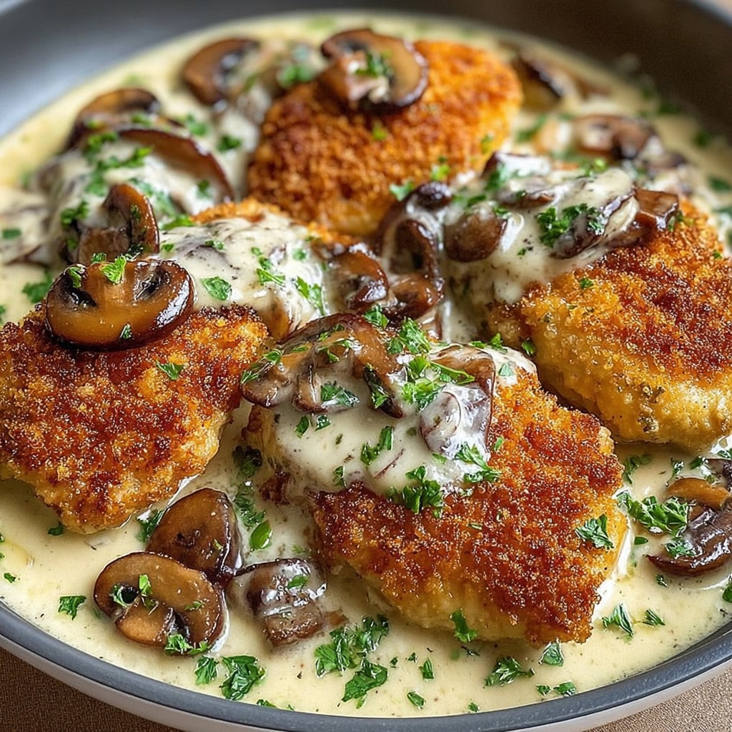 Disposez le poulet doré sur les assiettes de service et nappez-le généreusement de sauce aux champignons et parmesan. Pour une touche de fraîcheur et de couleur, parsemez de persil frais haché sur le dessus. La sauce crémeuse se marie parfaitement avec le poulet croustillant, apportant richesse et profondeur à chaque bouchée.