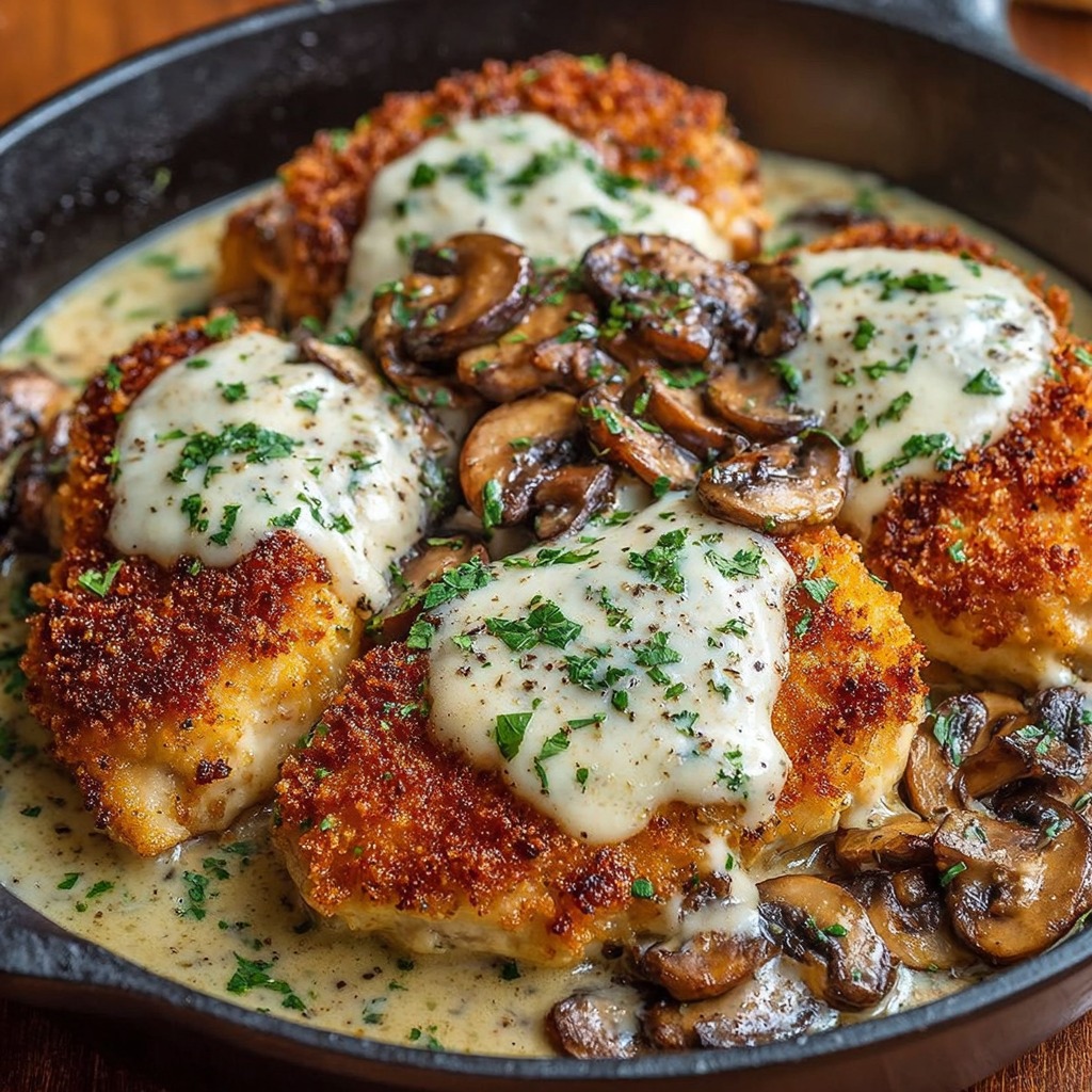 Pour une belle présentation, déposer le poulet sur une assiette, napper généreusement de sauce et parsemer de copeaux de parmesan frais. Ajouter quelques brins de persil pour la couleur. Servi chaud, ce plat séduit par son parfum de champignons et de fromage fondu. Chaque bouchée offre un équilibre parfait entre croustillant, crémeux et fondant.
