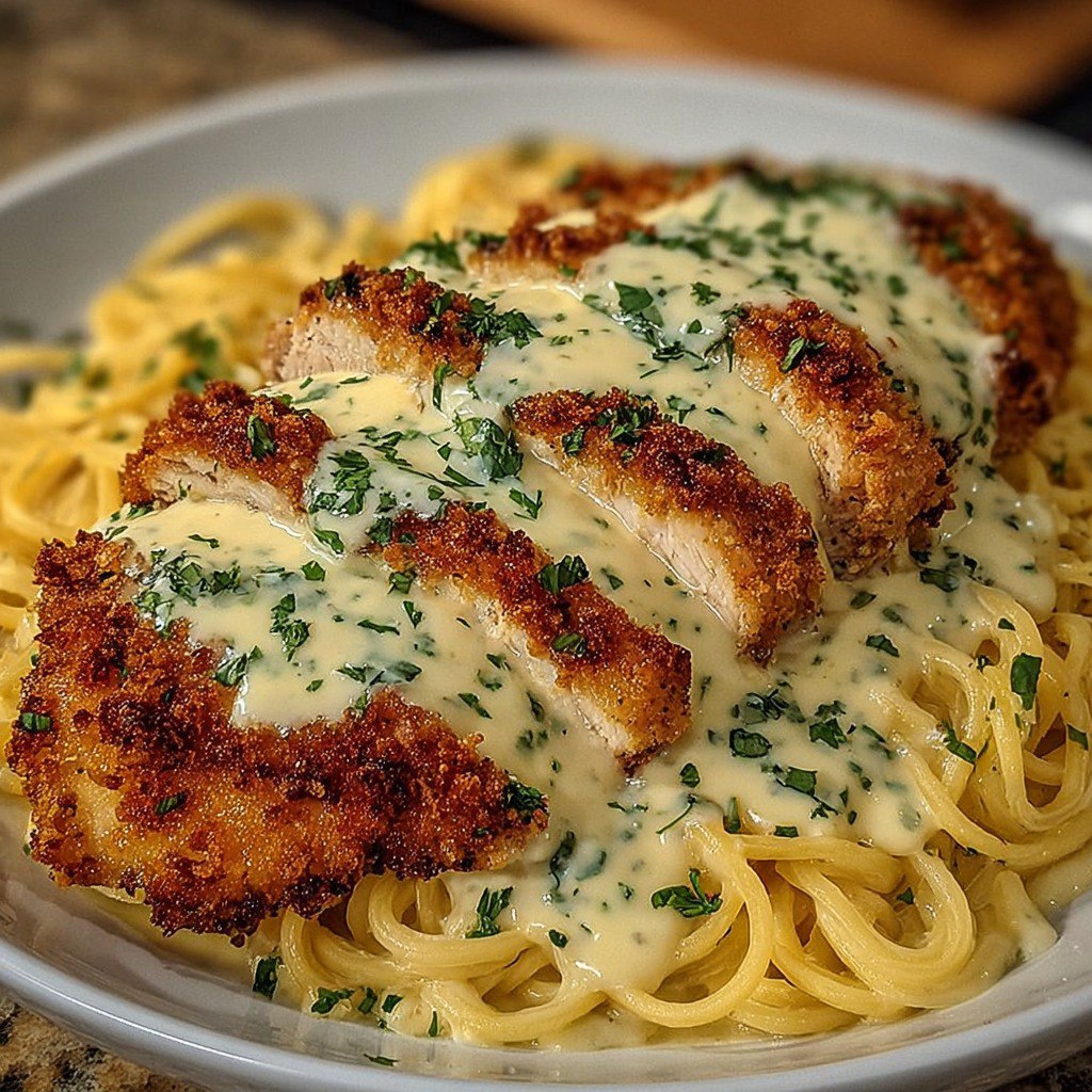 6. Service : Servez immédiatement le poulet en croûte de parmesan, nappé généreusement de sauce Alfredo. Ce plat se marie parfaitement avec des pâtes fraîches (comme des fettuccine ou des linguine) pour une expérience italienne complète, ou avec des légumes verts vapeur (brocoli, haricots verts) pour un repas plus léger et équilibré.