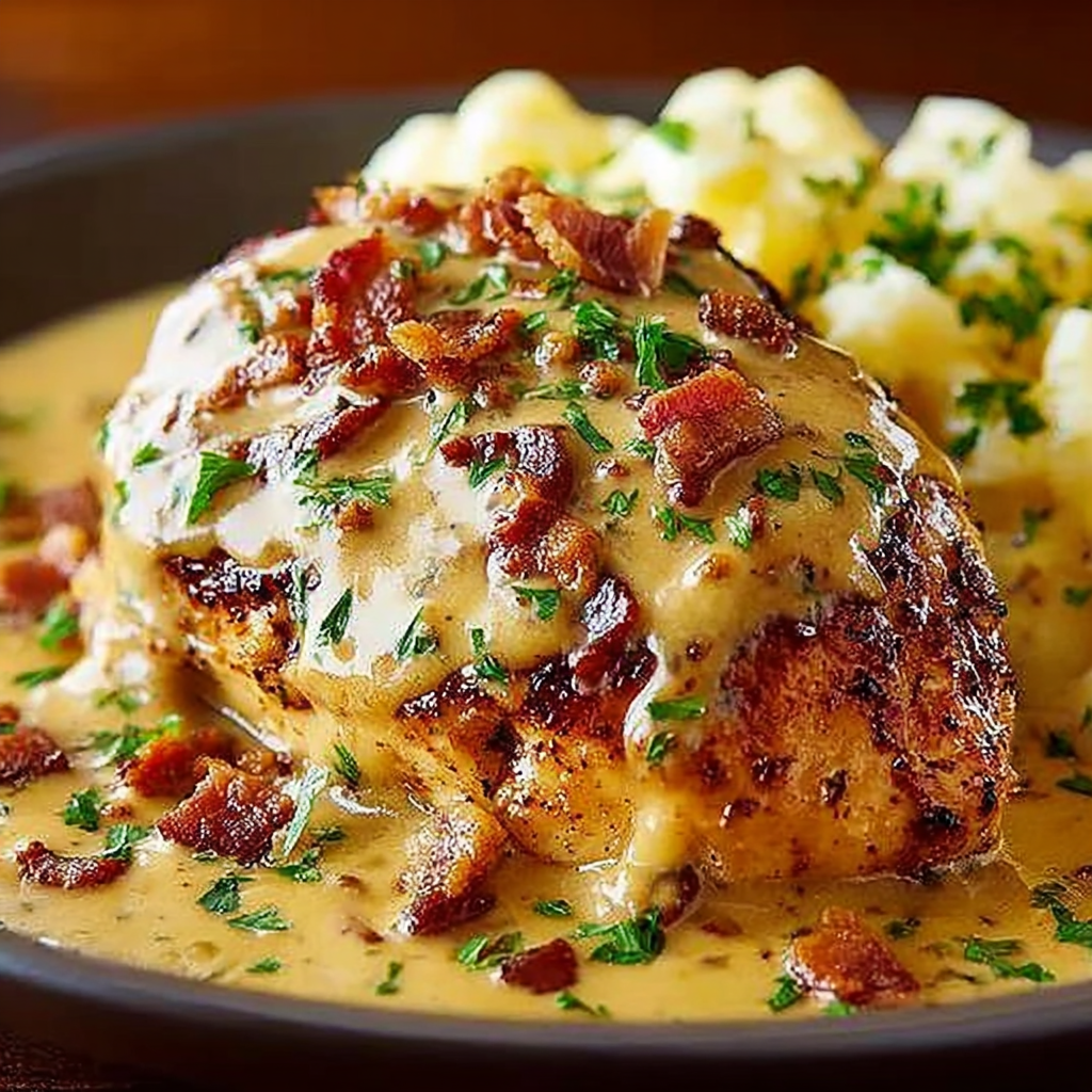 Le “Smothered Chicken” ou poulet étouffé est une spécialité du Sud des États-Unis, et le restaurant Texas Roadhouse en a fait l’une de ses recettes les plus populaires. Dans cette version typique, on retrouve des blancs de poulet grillés recouverts de champignons poêlés, oignons sautés, et d’une généreuse couche de fromage fondu, parfois accompagnée d’une sauce crémeuse au poivre ou au poulet.