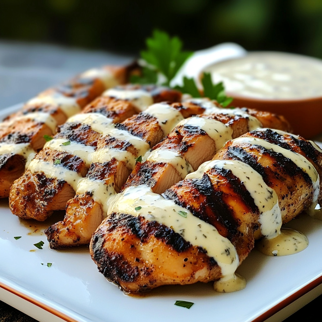 - Servez le poulet grillé bien chaud avec un généreux filet de sauce blanche Alabama sur le dessus ou à côté comme dip.