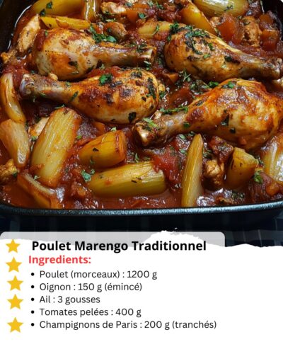 Le Poulet Marengo est une recette classique de la cuisine française, originaire du XIXe siècle, connue pour sa sauce généreuse à base de tomates, champignons et vin blanc.