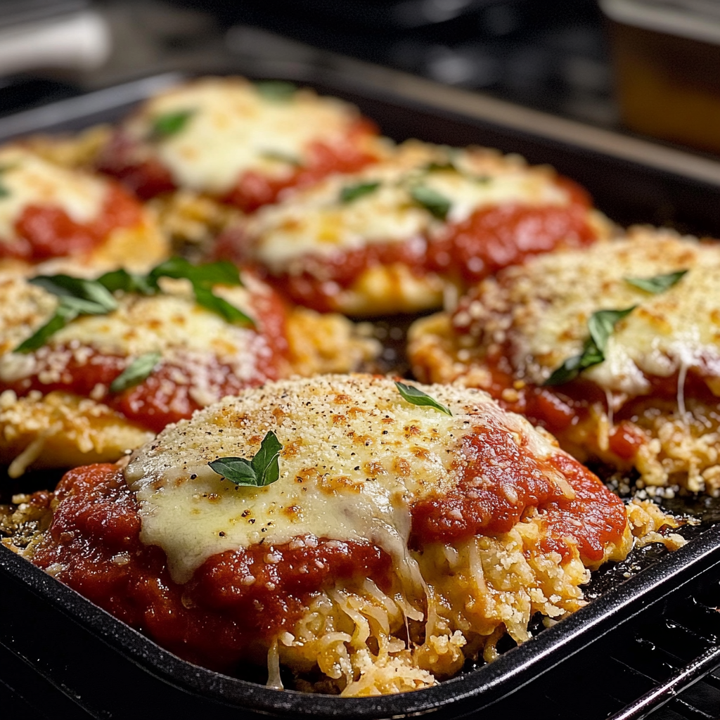 - Servez chaud : Laissez refroidir légèrement avant de servir. Accompagnez votre poulet parmesan d’une salade ou de pâtes pour un repas complet.