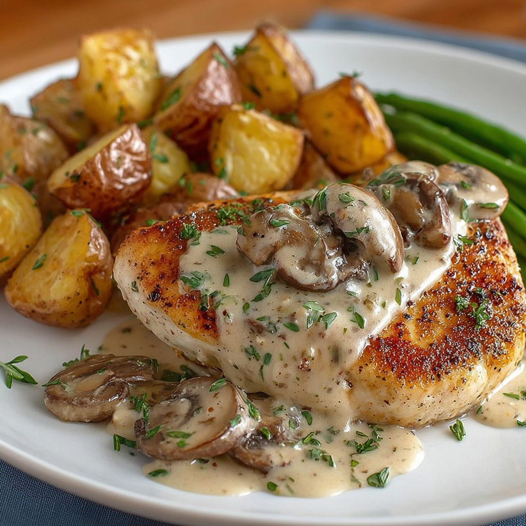 Ce poulet poêlé à la sauce crémeuse aux champignons et à l’ail, accompagné de pommes de terre rôties, est une recette facile, délicieuse et parfaite pour un repas de semaine comme pour un dîner entre amis. Riche en goût, généreuse et conviviale, elle deviendra vite un incontournable de vos menus maison. Bon appétit !