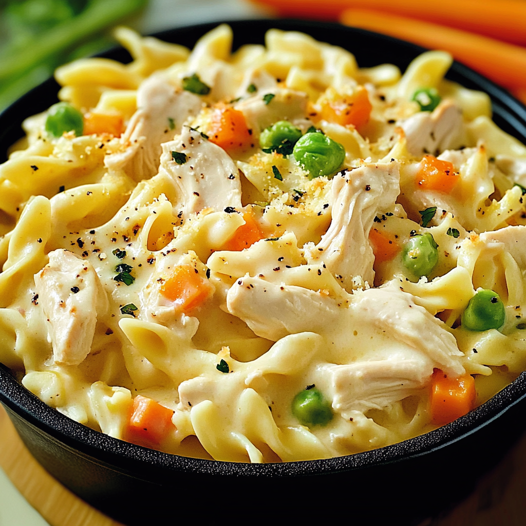Un repas réconfortant et simple avec du poulet, des légumes et des pâtes, prêt en un rien de temps !