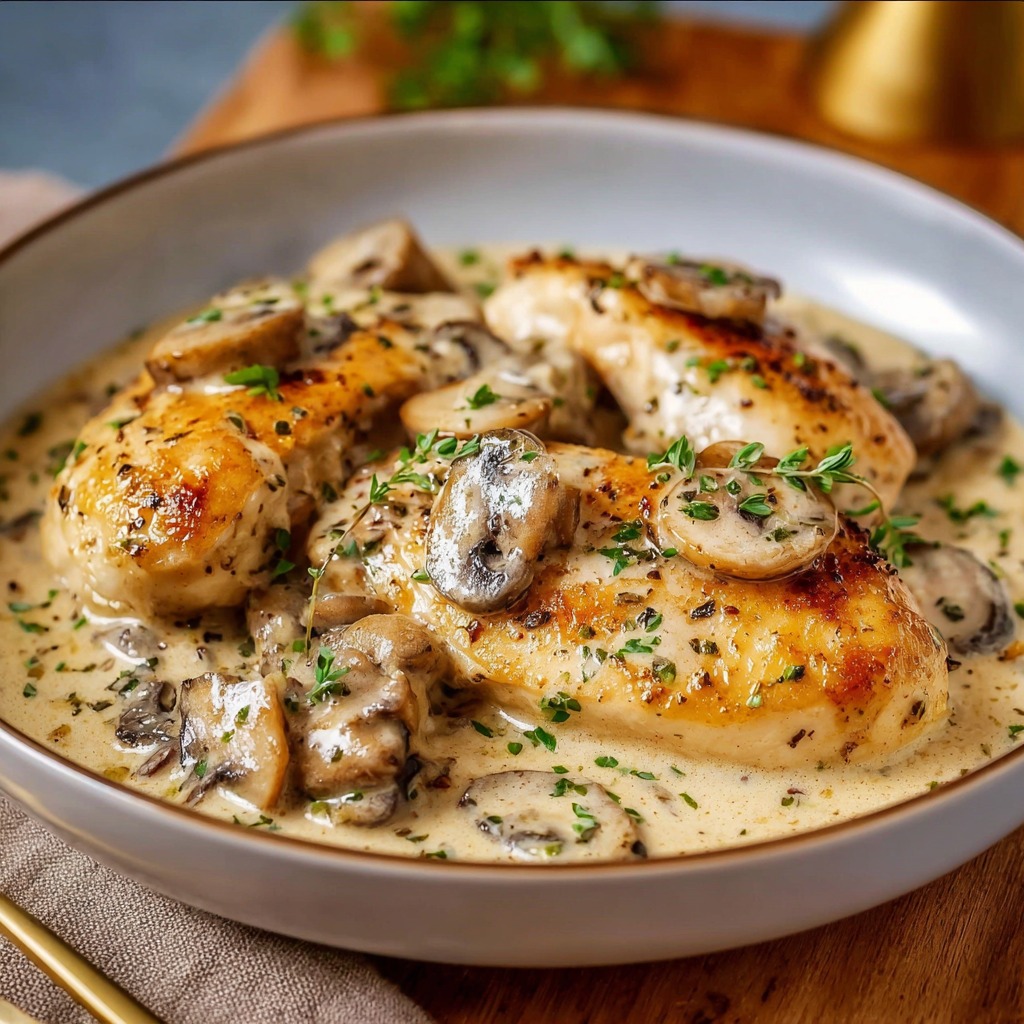 En fin de cuisson, le persil ciselé est ajouté pour apporter une note fraîche et herbacée. L’assaisonnement peut être ajusté à ce moment en ajoutant un peu de sel ou de poivre selon le goût. Le plat peut être servi immédiatement, accompagné de riz, de pâtes ou de pommes de terre vapeur. La sauce crémeuse, enrichie par les champignons, s’accorde parfaitement avec ces accompagnements qui absorbent et valorisent sa texture onctueuse.