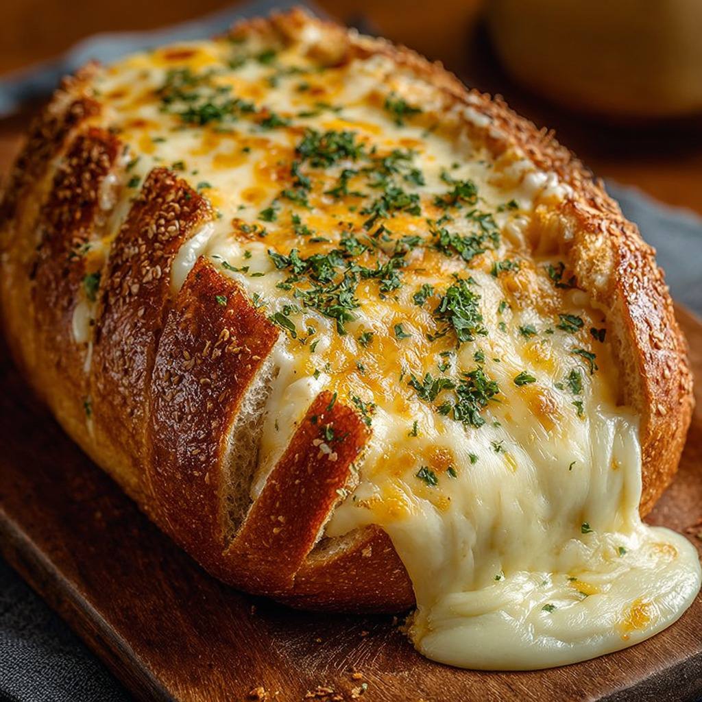 Couper le pain en tranches épaisses sans aller jusqu’au fond pour conserver la base intacte, créant ainsi un effet éventail. Cette découpe permet de glisser le beurre et le fromage dans chaque fente et facilite le service.