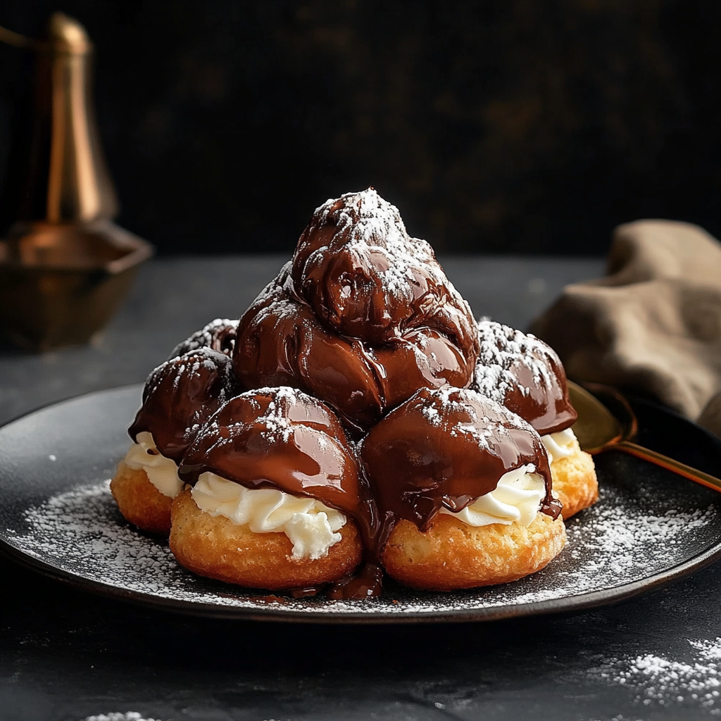 - Nappez de chocolat : Empilez quelques choux garnis sur une assiette et nappez généreusement de sauce au chocolat avant de servir.