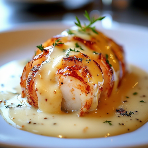 - Versez la sauce crémeuse au cognac généreusement sur les queues de homard.
