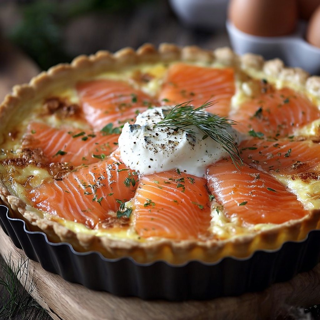 On verse la garniture sur la pâte déjà placée dans le moule. On veille à bien répartir les morceaux de saumon et le mélange crémeux. On peut parsemer le dessus de quelques brins d’aneth supplémentaires pour décorer. Le four doit être préchauffé à cent quatre-vingts degrés Celsius. On enfourne la quiche pour environ trente à quarante minutes, jusqu’à ce qu’elle soit bien dorée sur le dessus et que la garniture soit prise. Pour vérifier la cuisson, on plante la lame d’un couteau au centre : elle doit ressortir propre.