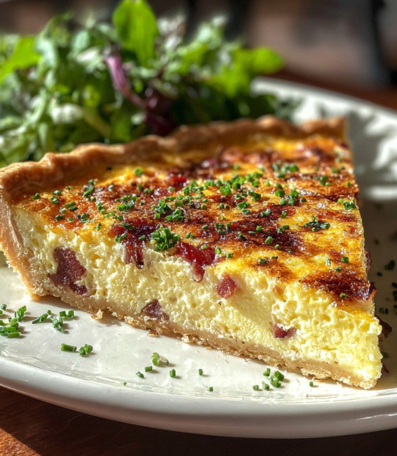 4. **Montage** : Répartissez les lardons sur le fond de tarte. Versez l’appareil par-dessus. Vous pouvez ajouter une fine couche de fromage râpé si vous le souhaitez.