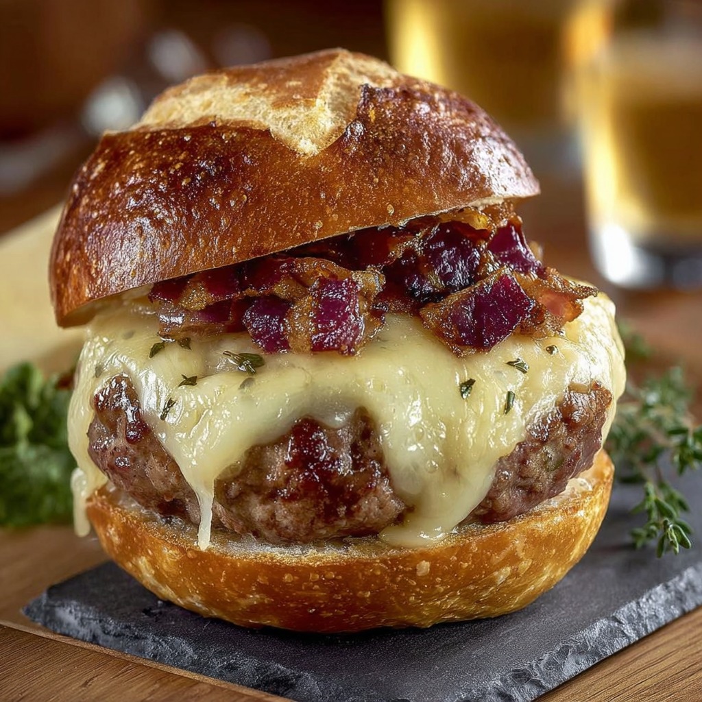 Ouvrir les pains à burger et, si désiré, les toaster légèrement. Sur la base, déposer une couche de pommes de terre tranchées, puis le steak avec le fromage fondu, les oignons caramélisés, le bacon croustillant et les cornichons. Ajouter un peu de moutarde ou de sauce burger selon goût. Refermer avec le chapeau du pain.
