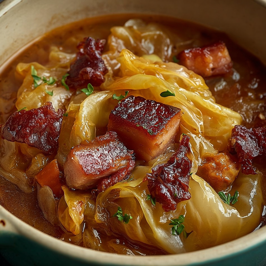 Le ragoût de chou au porc fumé est un plat rustique, généreux et profondément réconfortant. Il illustre parfaitement la cuisine mijotée : simple, économique et riche en goût.