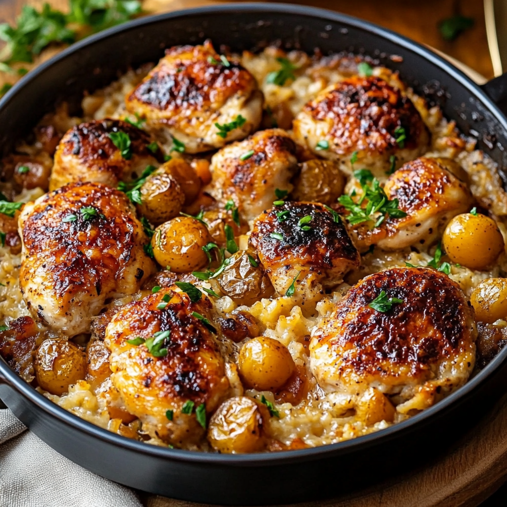 Une fois la cuisson terminée, sortez le plat du four et laissez-le reposer quelques minutes. Cela permet aux saveurs de se stabiliser et au poulet de rester juteux. Servez chaud et garnissez avec des herbes fraîches comme du persil ou de la coriandre, si désiré.