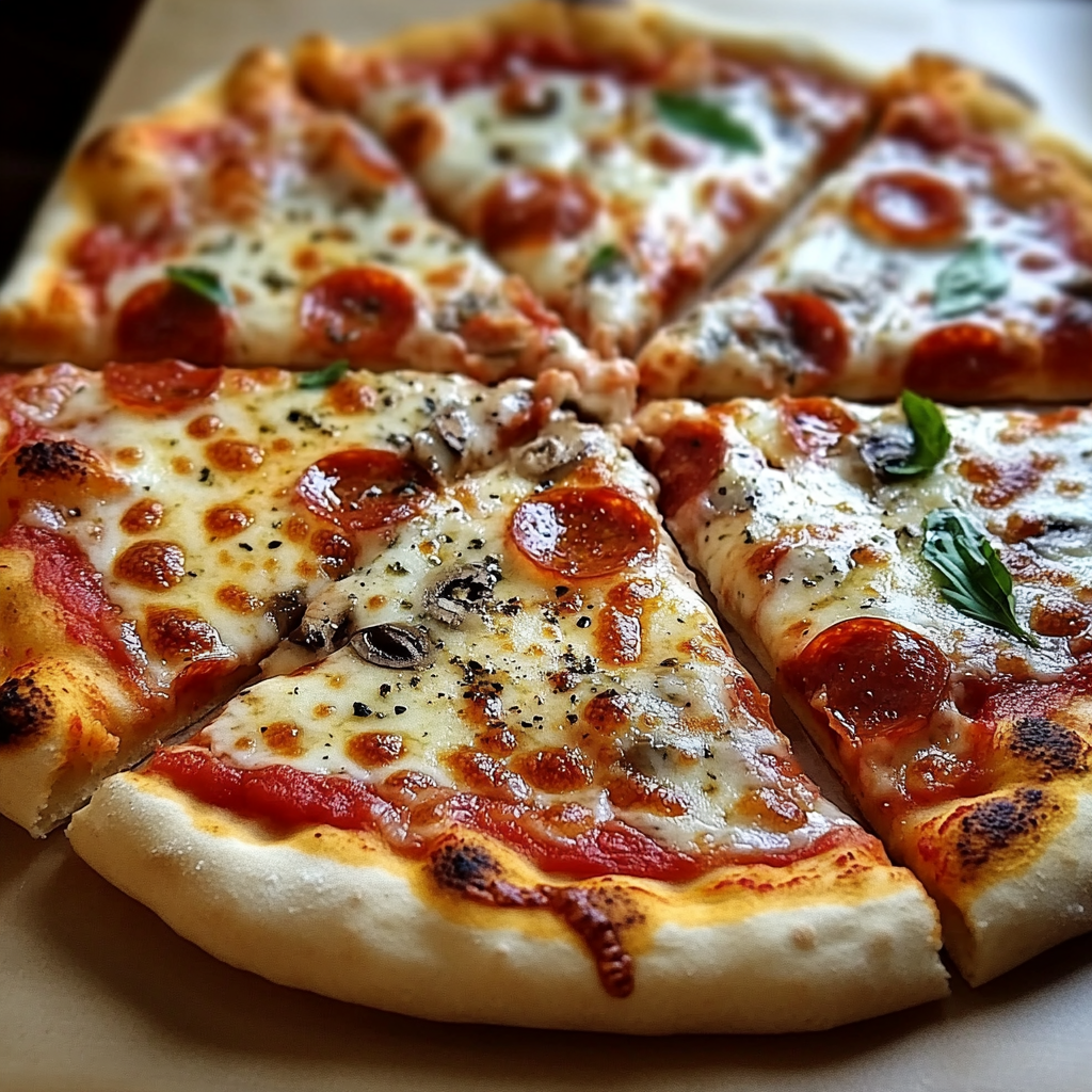 - Garnitures de votre choix : pepperoni, champignons, poivrons, oignons, saucisse, olives, etc.
