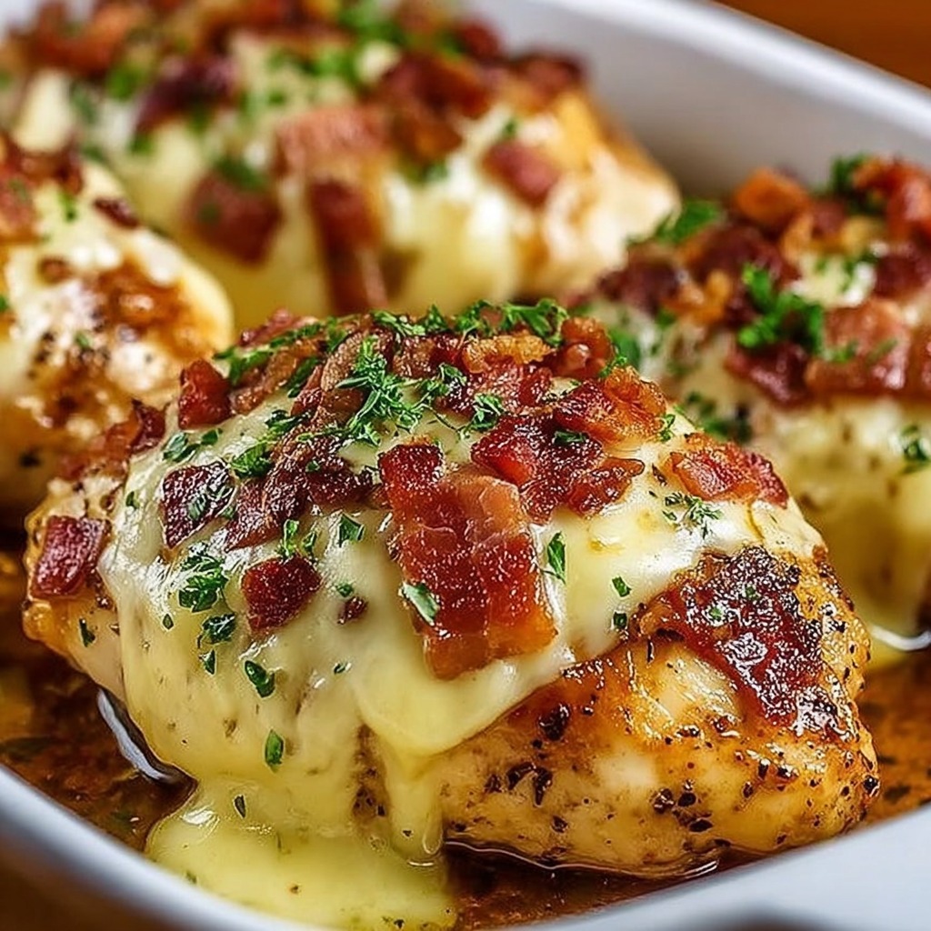 Au moment de servir, on peut disposer chaque poitrine de poulet sur une assiette, accompagnée d’un peu de sauce et d’un légume coloré. Le contraste entre le fromage fondu et doré, le bacon croustillant et la chair blanche du poulet crée un visuel très appétissant. Pour une présentation plus raffinée, on peut couper le poulet en tranches et le présenter en éventail, nappé de sauce.