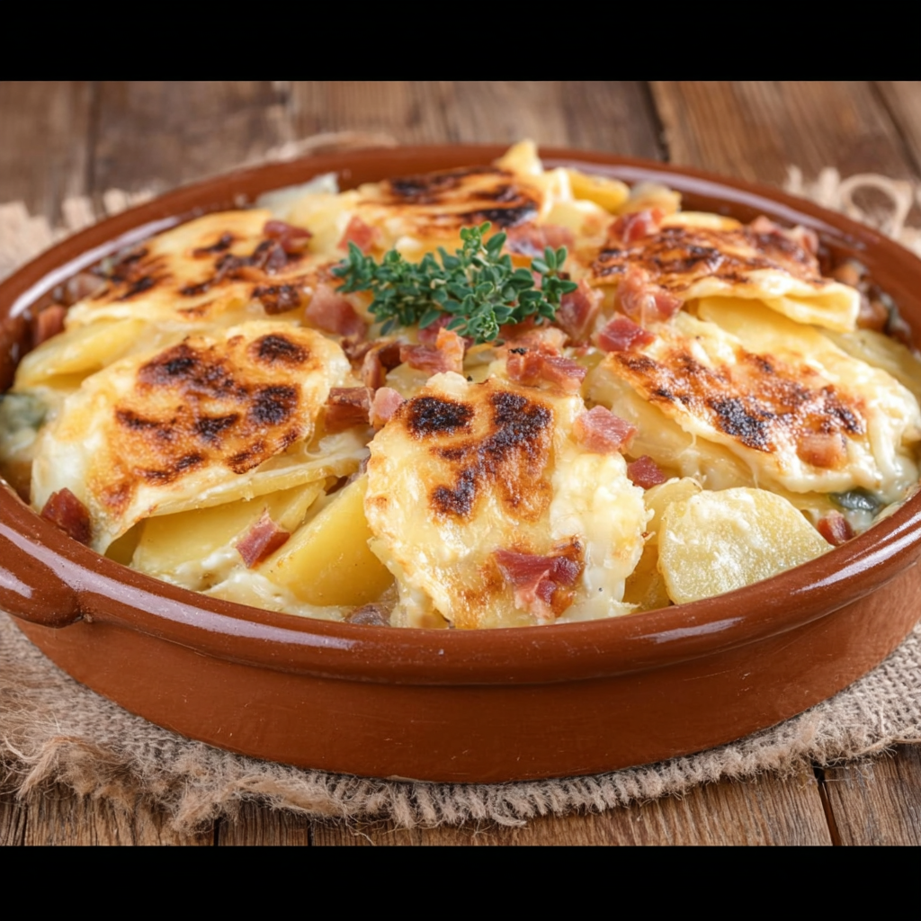 Les pommes de terre à chair ferme sont essentielles pour obtenir une texture parfaite : elles tiennent bien à la cuisson et absorbent délicatement les saveurs de la crème et du fromage. L’oignon apporte une note douce et légèrement sucrée qui équilibre le côté fumé des lardons.